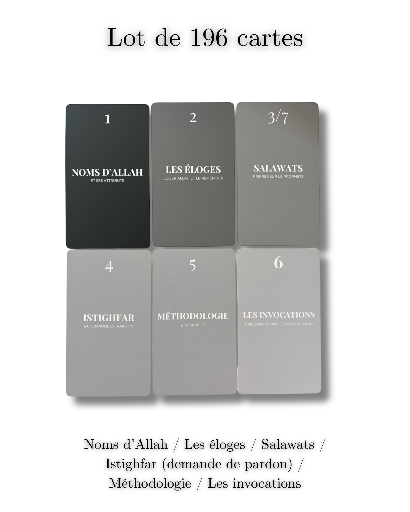Les cartes contiennent des invocations en français/arabe/phonétique, organisés par thème, pour vous guider avec clarté à chaque étape.